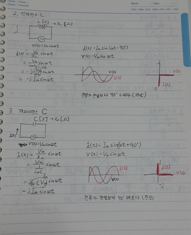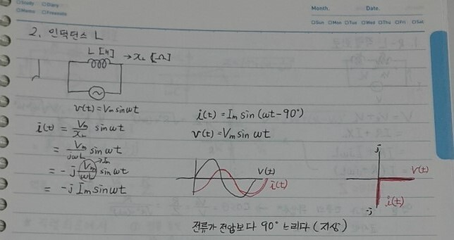 인덕터 회로에서 전압 전류 식을 살펴보면, 전압의 위상이 90도 빠릅니다(전류가 90보다 느립니다) 지상