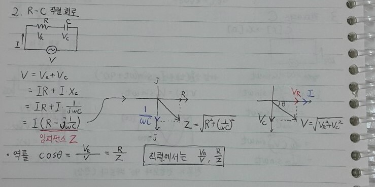 VC가 아래로 내려갔다는 점! 여기는 전압이 전류보다90도 느립니다(=전류가 90도 빠릅니다, 진상회로)