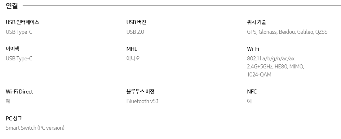 아래는 삼성전자 홈페이지에서 발췌한 내용이며, Wi-Fi 부분을 보자. 802.11a/b/g/n/ac/ax 까지 모든 규격을 지원하고 있다. 또한 2.4G, 5G, 6G 까지 지원(Wi-Fi 6E), HE160 에 MIMO, 1024-QAM 지원하는 것은 Galaxy S21과 같은 수준의 와이파이 기술이다. 그렇다면 앞으로 나오는 삼성의 최신모델은 모두 이렇게 나오는 것일까?