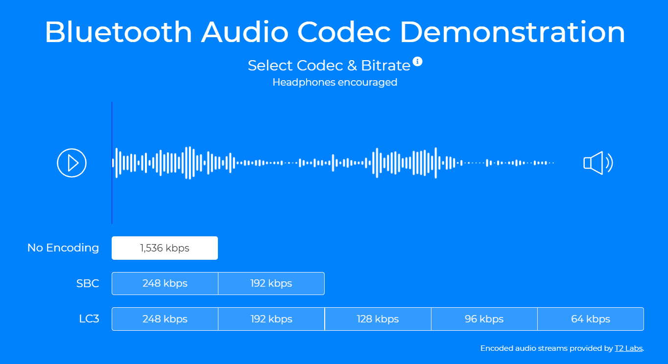 대규모로 진행된 청각 테스트에서 LC3는 클래식 오디오에 포함된 SBC 코덱 대비 50% 더 낮은 비트 전송률에서도 오디오 품질이 향상되는 것으로 나타났습니다.